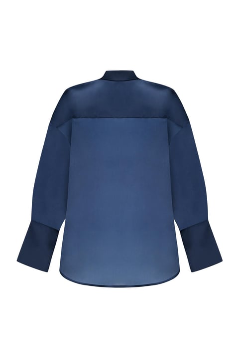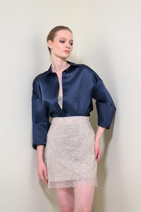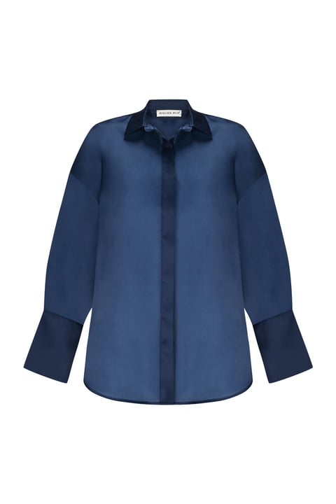 قميص حريري ذو ياقة واقفة وقصة واسعة.
