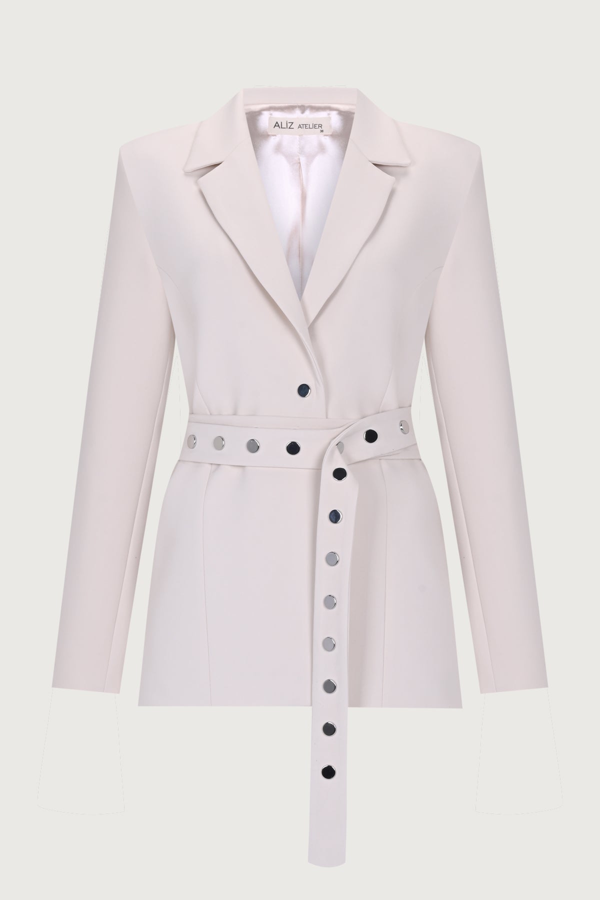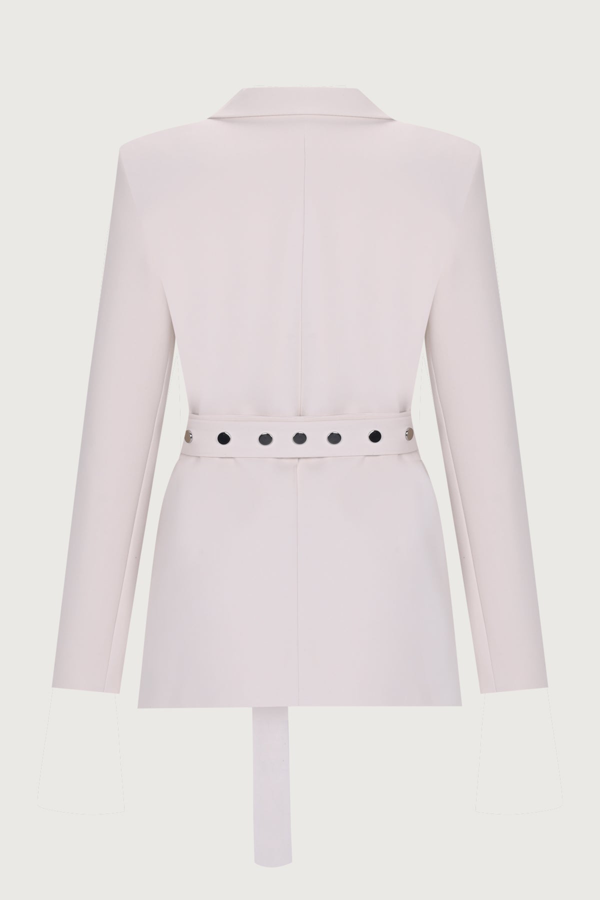 إغلاق أمامي بأزرار كبس، سترة مبطنة بحزام قابل للتعديل يلتف حول الخصر.
