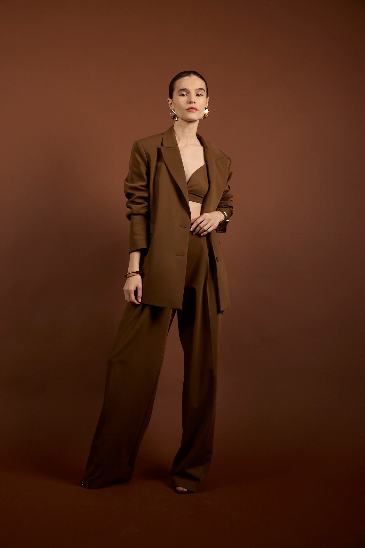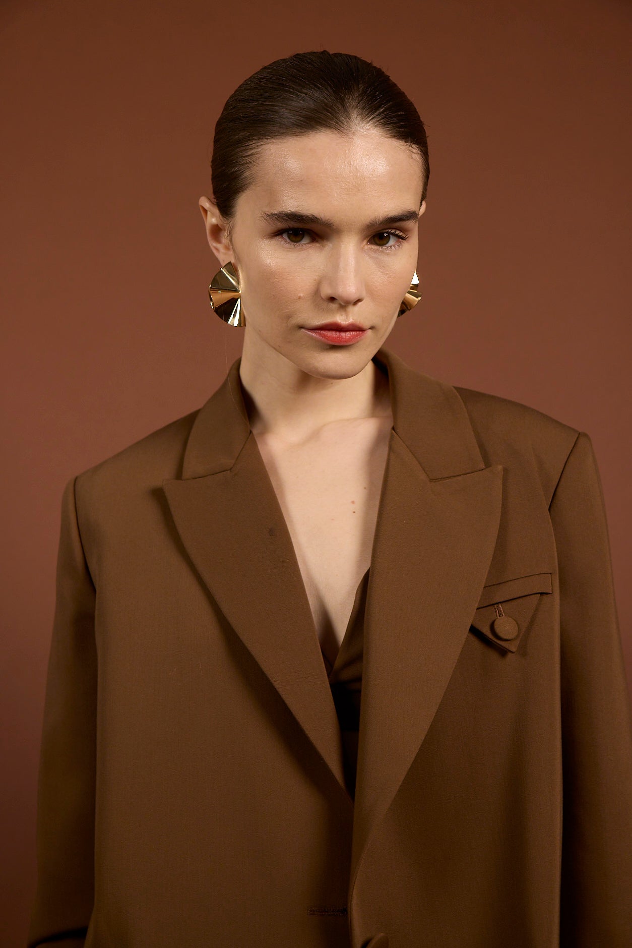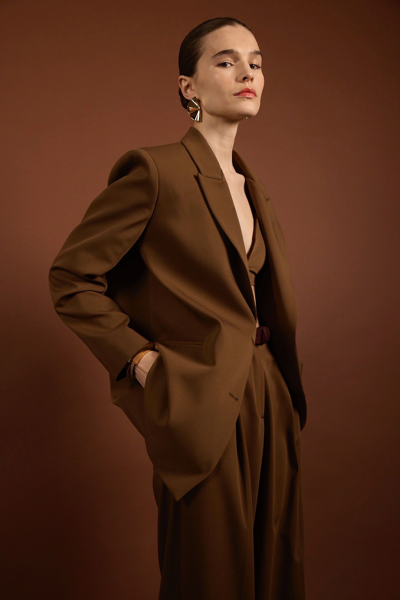 سترة بليزر ذات ياقة مدببة. تحتوي اللوحة الأمامية وخط الصدر على تفاصيل جيوب جانبية.