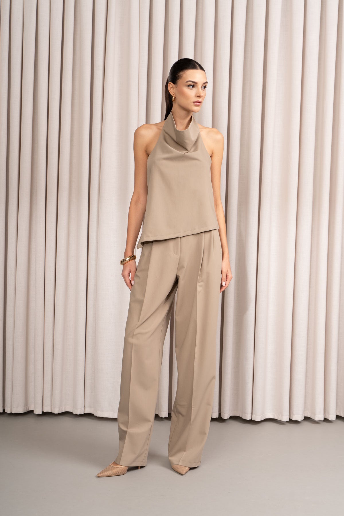 بنطلون ذو خصر متوسط ​​وساق واسعة.