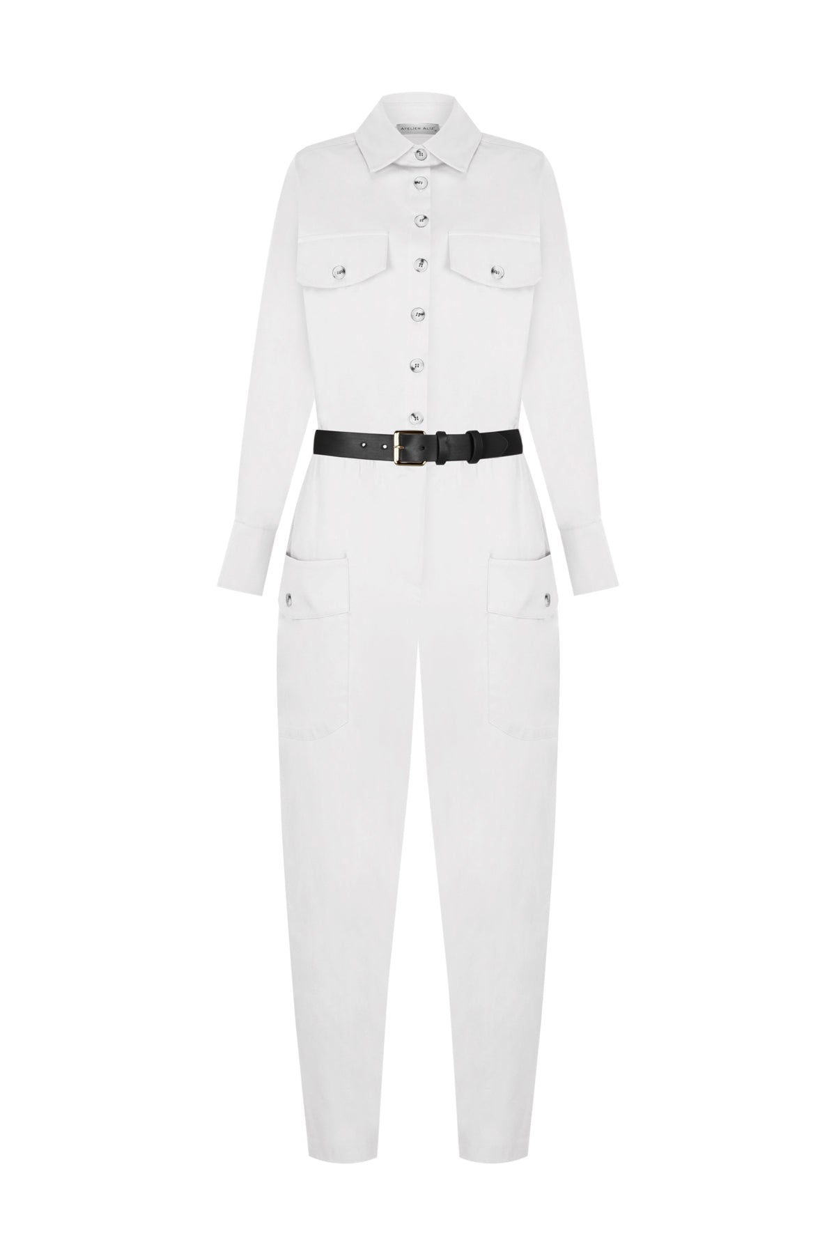 Jumpsuit with a high collar.