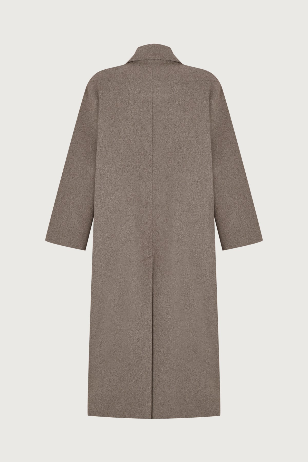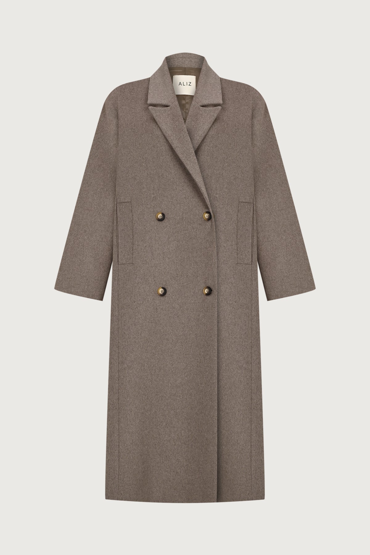 Double-breasted maxi wool coat with side pockets and button closure.