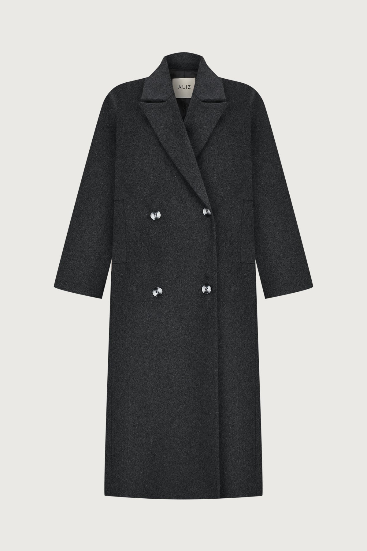 Product Features Fabric composition: 55% Wool, 45% PES Double-breasted maxi wool coat with side pockets and button closure.