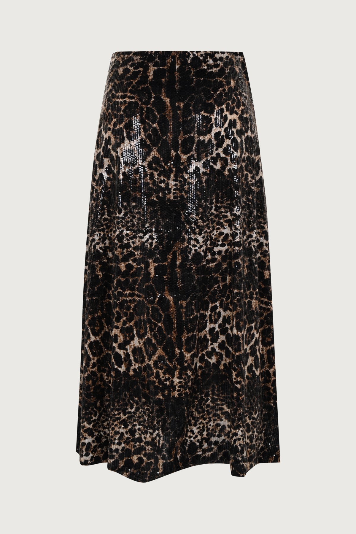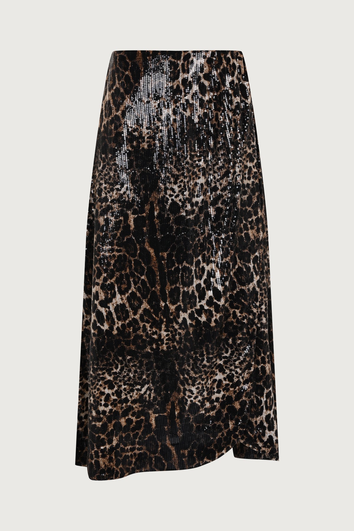 Kruvaze kapamalı, leopar desenli pullu, pervaz temizlemeli kemerli ve ön üst kenarı pileli etek