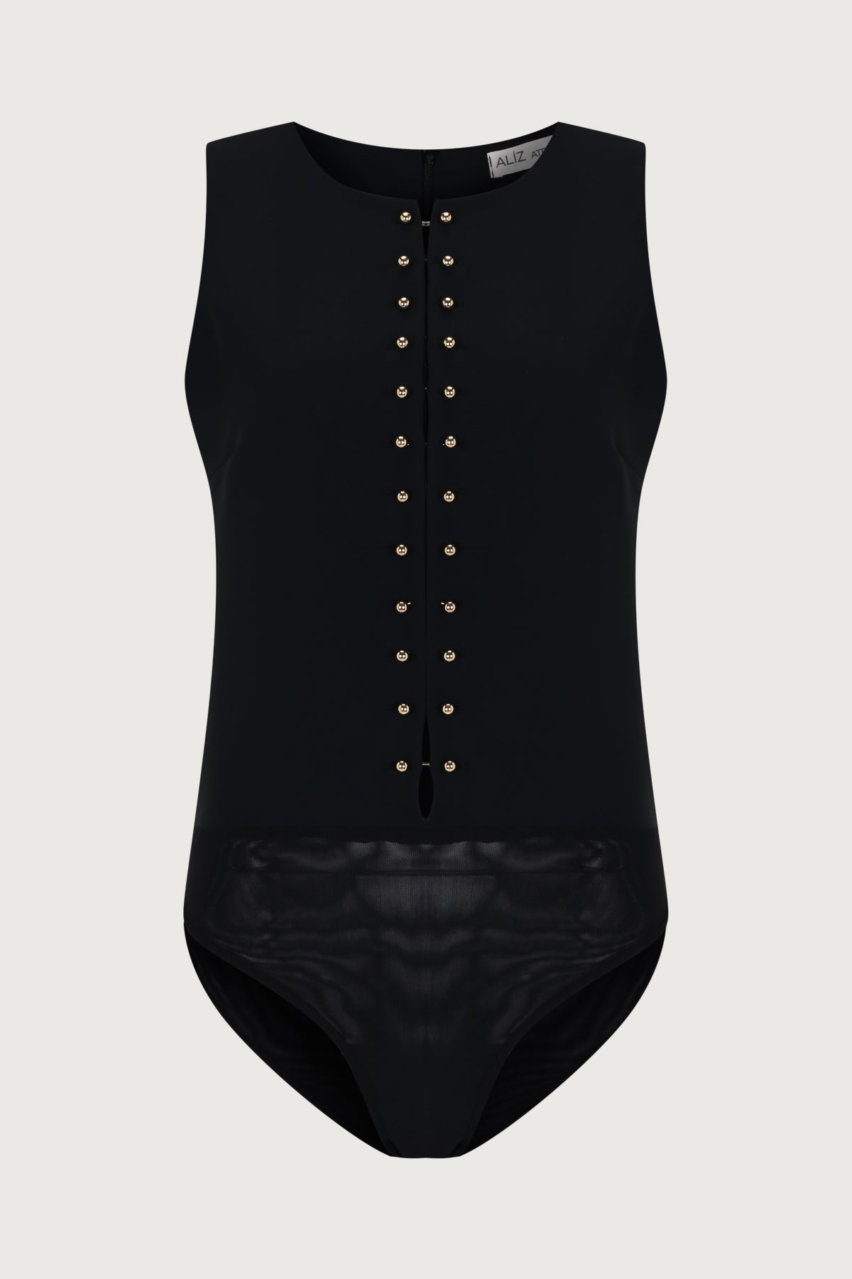 Arka ortadan fermuarlı, ağ kısmı çıtçıtlı, önden takılıp çıkarılabilir piercingli body.