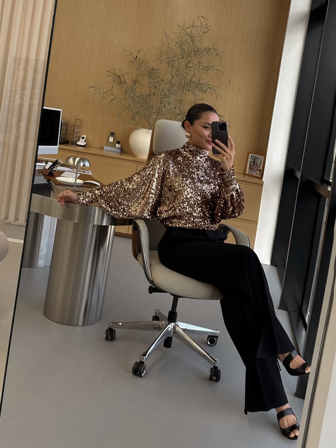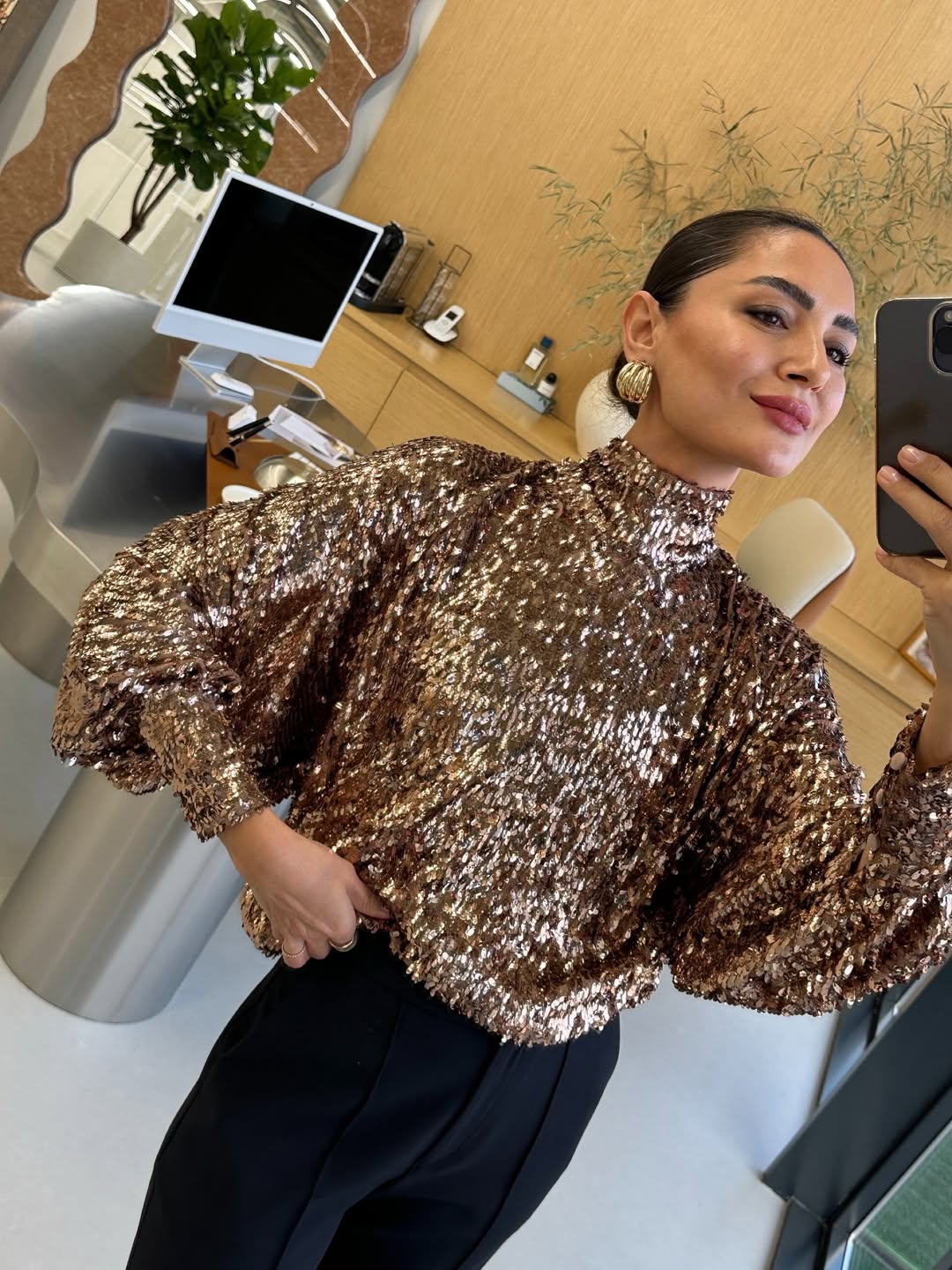 Yakası düğme kapama,yarasa kol,pul payetli bluz.