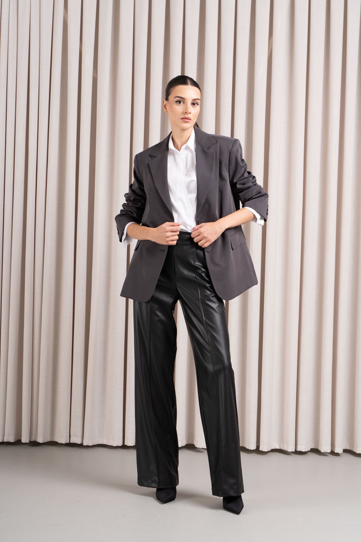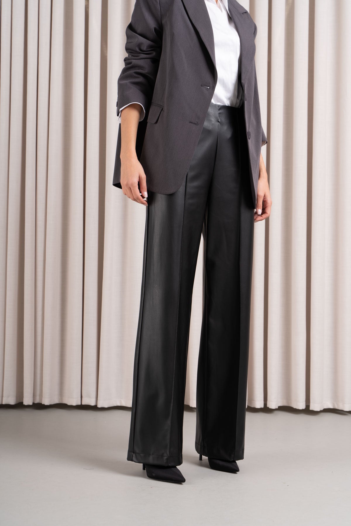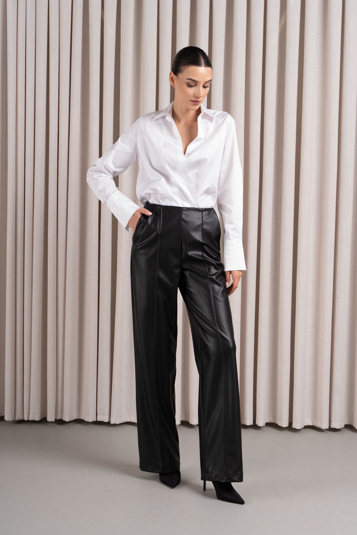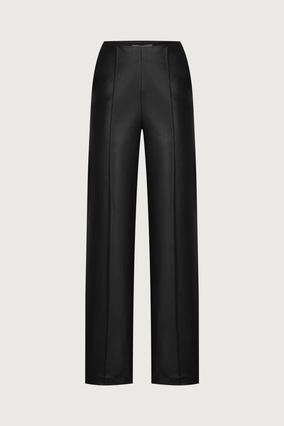Yüksek bel, nervür dikişli, suni deri pantolon.
